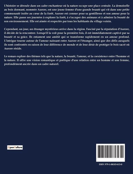 L'histoire se déroule dans un cadre enchanteur où la nature occupe une place centrale. La demoiselle au bois dormant, nommée Aurore, est une jeune femme d'une grande beauté qui vit dans une petite communauté isolée au c¿ur de la forêt. Aurore est connue pour sa gentillesse et son amour pour la nature. Elle passe ses journées à explorer la forêt, à s'occuper des animaux et à admirer la beauté de son environnement. Elle est aimée et respectée par tous les habitants du village voisin. Cependant, un jour, un étranger mystérieux arrive dans la région. Fasciné par la réputation d'Aurore, il décide de la rencontrer. Lorsqu'il la voit pour la première fois, il est immédiatement captivé par sa beauté et sa grâce. Ils entament une amitié qui se transforme rapidement en un amour profond. L'intrigue tourne autour de l'amour naissant entre Aurore et l'étranger, ainsi que des défis auxquels ils sont confrontés en raison de leur différence de monde et de leur désir de protéger le bois sacré où Aurore réside. Le roman explore des thèmes tels que la nature, la beauté, l'amour, et la coexistence entre l'homme et la nature. Il offre une vision romantique et poétique d'une relation entre un homme et une femme, profondément ancrée dans un cadre naturel.