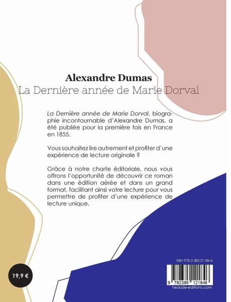La Dernière année de Marie Dorval, biographie incontournable d'Alexandre Dumas, a été publiée pour la première fois en France en 1855. Vous souhaitez lire autrement et profiter d¿une expérience de lecture originale ? Grâce à notre charte éditoriale, nous vous offrons l¿opportunité de découvrir cette nouvelle dans une édition aérée et dans un grand format, facilitant ainsi votre lecture pour vous permettre de profiter d¿une expérience de lecture unique.