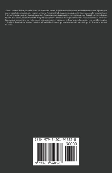 Carlos Antonio Carrasco, présente L'ultime confession d'un libertin, sa première oeuvre littéraire. Aujourd'hui chroniqueur diplomatique pour la presse latino-américaine, il a parcouru la planète, s'entourant à la fois de personnes de pouvoir et de personnes plus modestes. Fruits de ses pérégrinations perverses, les quelques dizaines d'aventures amoureuses alimentent son imagination pour dresser le portrait de l'âme et du corps de la femme, avec un érotisme fin et élégant, qui décrit avec maîtrise et malice pour provoquer la curiosité malsaine du confesseur. L'existence du narrateur avec son cynisme subtil semble s'apparenter à un orgasme prolongé avec quelques pauses pour travailler, conspirer et dérober la femme de son prochain. Tout cela, à la recherche d'éléments qui lui serviront à tisser une trame qui fera de sa vie, le meilleur des romans.