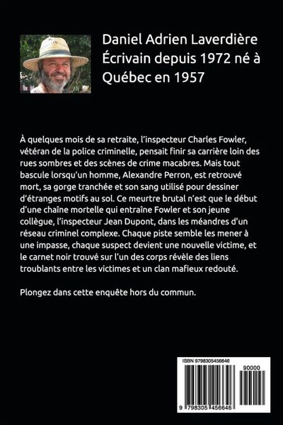 À quelques mois de sa retraite, l'inspecteur Charles Fowler, vétéran de la police criminelle, pensait finir sa carrière loin des rues sombres et des scènes de crime macabres. Mais tout bascule lorsqu'un homme, Alexandre Perron, est retrouvé mort, sa gorge tranchée et son sang utilisé pour dessiner d'étranges motifs au sol. Ce meurtre brutal n'est que le début d'une chaîne mortelle qui entraîne Fowler et son jeune collègue, l'inspecteur Jean Dupont, dans les méandres d'un réseau criminel complexe. Chaque piste semble les mener à une impasse, chaque suspect devient une nouvelle victime, et le carnet noir trouvé sur l'un des corps révèle des liens troublants entre les victimes et un clan mafieux redouté. Plongez dans cette enquête hors du commun.