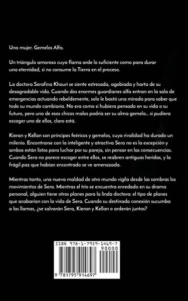 Un triángulo amoroso cuya flama arde lo suficiente como para durar una eternidad, si no consume la Tierra en el proceso.¿¿ La doctora Serafina Khouri se siente estresada, agobiada y harta de su desagradable vida. Cuando dos enormes guardianes alfa entran en la sala de emergencias actuando rebeldemente, solo le bastó una mirada para saber que todo su mundo cambiaría. No era como si hubiera pensado en su vida o su futuro, pero uno de esos chicos malos podría ser su alma gemela... si pudiera escoger uno de ellos, claro está. ¿¿ Kieran y Kellan son príncipes feéricos y gemelos, cuya rivalidad ha durado un milenio. Encontrarse con la inteligente y atractiva Sera no es la excepción y ambos están listos para luchar por su pareja, sin pensar en las consecuencias. Cuando Sera no parece escoger entre ellos, se reabren antiguas heridas, y la frágil paz que habían encontrado se ve amenazada. ¿¿ Mientras tanto, una nueva maldad de otro mundo vigila desde las sombras los movimientos de Sera. Mientras el trío se encuentra enredado en su drama personal, alguien tiene otros planes para la linda doctora: el tipo de planes que acabarían con la vida de Sera. Cuando su destinada conexión sucumba a las llamas, ¿se salvarán Sera, Kieran y Kellan o arderán juntos?¿