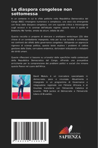 In un contesto in cui le sfide politiche nella Repubblica Democratica del Congo (RDC) rimangono numerose e complesse, una voce sta emergendo con forza dalla diaspora congolese, con uno sguardo critico e intransigente sugli eccessi e le carenze dell'attuale regime: questa voce è quella di Boketshu Wa Yambo, amato da alcuni, odiato da altri.Questa raccolta si propone di elencare e analizzare venticinque (25) idee chiave di un combattente impegnato, noto per la sua lucidità e schiettezza nei confronti dei difetti della governance congolese. Utilizzando un approccio rigoroso di scienza politica, questo testo esplora i problemi di cattiva gestione dello Stato, corruzione endemica, disfunzioni istituzionali e violazioni dei diritti umani.Queste riflessioni si basano su un'analisi delle specifiche realtà contestuali della Repubblica Democratica del Congo, offrendo una prospettiva arricchente per la comprensione dei problemi politici e sociali che minano questo Paese nel cuore dell'Africa.