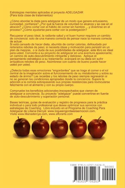 COACHING PARA ADELGAZAR-MANUAL DE ESTRATEGIAS para impulsar todo tipo de tratamiento: abordar la dieta con entusiasmo, curiosidad, confianza; para dejar de comer sin hambre; superar la postergación y el vínculo enfermizo con la comida. Recuperar el peso ideal con buena salud y buen humor requiere un cambio de conciencia; potenciar aspectos de su personalidad para evitar recaídas. Los rebotes de peso regresarán si no se generan condiciones internas apropiadas. Retome el vínculo sano con el alimento y con el cuerpo curando emociones "engordantes", esas que traga al comer. Si está cansado de contar calorías, de los atracones; si necesita motivación, o duda poder rebajar, este manual es ideal para usted: Apto para la práctica individual y para el profesional que desee optimizar sus servicios con estrategias de coaching. Incluido en el Programa de Coaching Para Adelgazar de Liliana Dercyé disponible en www.aflorarte.com, www.loqueengordaeslaemocion.com y www.lilianadercye.com
