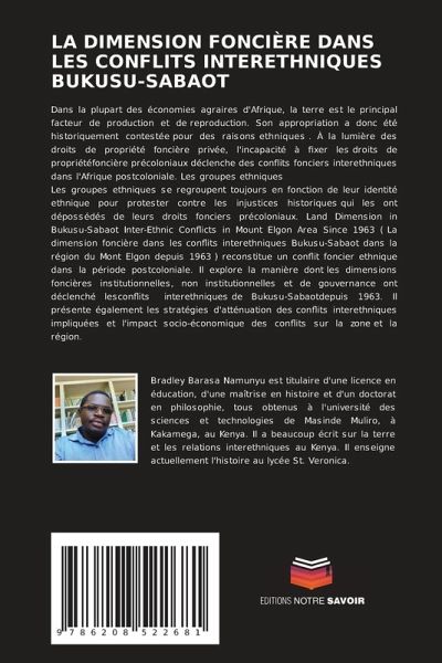 Dans la plupart des économies agraires d'Afrique, la terre est le principal facteur de production et de reproduction. Son appropriation a donc été historiquement contestée pour des raisons ethniques . À la lumière des droits de propriété foncière privée, l'incapacité à fixer les droits de propriétéfoncière précoloniaux déclenche des conflits fonciers interethniques dans l'Afrique postcoloniale. Les groupes ethniquesLes groupes ethniques se regroupent toujours en fonction de leur identité ethnique pour protester contre les injustices historiques qui les ont dépossédés de leurs droits fonciers précoloniaux. Land Dimension in Bukusu-Sabaot Inter-Ethnic Conflicts in Mount Elgon Area Since 1963 ( La dimension foncière dans les conflits interethniques Bukusu-Sabaot dans la région du Mont Elgon depuis 1963 ) reconstitue un conflit foncier ethnique dans la période postcoloniale. Il explore la manière dont les dimensions foncières institutionnelles, non institutionnelles et de gouvernance ont déclenché lesconflits interethniques de Bukusu-Sabaotdepuis 1963. Il présente également les stratégies d'atténuation des conflits interethniques impliquées et l'impact socio-économique des conflits sur la zone et la région.