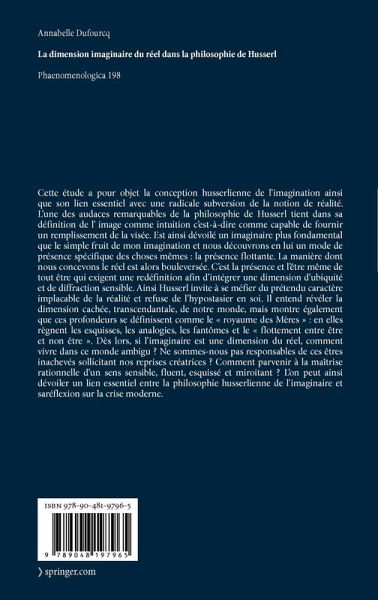 INTRODUCTION.- Section I. Elaboration de la notion d'imagination dans la réflexion husserlienne.- Chapitre 1. La définition de l'imagination par Husserl : l'originalité fondamentale et les nombreux points d'hésitation.- Chapitre 2. Resserrement du concept d'image autour de l'idée d'une présence intuitive directe.- Section II. Fécondité de la phantasia : le « comme-si » en tant qu'enrichissement de notre expérience.- Chapitre1. Image, contemplation esthétique et épochè.- Chapitre 2. Les possibles..- Chapitre 3. Les essences.- Chapitre 4. Autrui.- Section III. L'émergence de l'imaginaire dans les profondeurs du réel.- Chapitre 1. Les fantômes de la perception.- Chapitre 2. Les profondeurs du réel : le royaume des Mères.- Chapitre 3. Les analogies.- Chapitre 4. Les esquisses.- Chapitre 5. Le moi transcendantal peut-il être une origine flottante ?- CONCLUSION.- BIBLIOGRAPHIE.- INDEX NOMINUM.- INDEX RERUM.