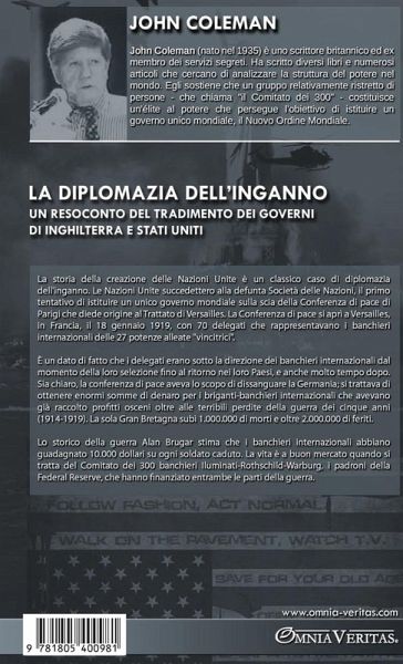 La storia della creazione delle Nazioni Unite è un classico caso di diplomazia dell'inganno. Le Nazioni Unite succedettero alla defunta Società delle Nazioni, il primo tentativo di istituire un unico governo mondiale sulla scia della Conferenza di pace di Parigi che diede origine al Trattato di Versailles. La Conferenza di pace si aprì a Versailles, in Francia, il 18 gennaio 1919, con 70 delegati che rappresentavano i banchieri internazionali delle 27 potenze alleate "vincitrici". È un dato di fatto che i delegati erano sotto la direzione dei banchieri internazionali dal momento della loro selezione fino al ritorno nei loro Paesi, e anche molto tempo dopo. Sia chiaro, la conferenza di pace aveva lo scopo di dissanguare la Germania; si trattava di ottenere enormi somme di denaro per i briganti-banchieri internazionali che avevano già raccolto profitti osceni oltre alle terribili perdite della guerra dei cinque anni (1914-1919). La sola Gran Bretagna subì 1.000.000 di morti e oltre 2.000.000 di feriti. Lo storico della guerra Alan Brugar stima che i banchieri internazionali abbiano guadagnato 10.000 dollari su ogni soldato caduto. La vita è a buon mercato quando si tratta del Comitato dei 300 banchieri Iluminati-Rothschild-Warburg, i padroni della Federal Reserve, che hanno finanziato entrambe le parti della guerra.