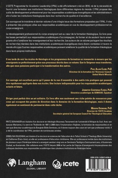 L'ICETE Programme for Academic Leadership (IPAL) a été officiellement créé en 2010, né de la nécessité de fournir une formation aux institutions théologiques dans différentes régions du monde. L'IPAL propose des outils de développement professionnel pour les responsables académiques évangéliques et les administrateurs afin d'aider les institutions théologiques dans leur recherche de qualité et d'excellence. Cet ouvrage est le troisième et dernier volume d'une trilogie issue des formations proposées par l'IPAL. Il vise à présenter des pratiques utiles aux responsables académiques en vue du développement professionnel du corps enseignant. Le développement professionnel du corps enseignant est au coeur de la formation théologique. Ce livre pose les bases permettant aux responsables académiques d'accompagner, de former et de soutenir leurs enseignants afin d'améliorer leur enseignement et leur recherche. Les auteurs de ce volume partagent les résultats de recherches menées dans des institutions académiques évangéliques dans divers contextes à travers le monde afin que d'autres responsables académiques puissent améliorer la qualité de la formation théologique dans leurs propres institutions.