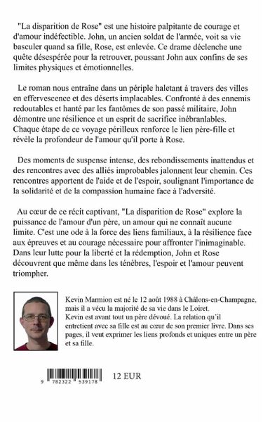 "La disparition de Rose" est une histoire palpitante de courage et d'amour indéfectible. John, un ancien soldat de l'armée, voit sa vie basculer quand sa fille, Rose, est enlevée. Ce drame déclenche une quête désespérée pour la retrouver, poussant John aux confins de ses limites physiques et émotionnelles. Le roman nous entraîne dans un périple haletant à travers des villes en effervescence et des déserts implacables. Confronté à des ennemis redoutables et hanté par les fantômes de son passé militaire, John démontre une résilience et un esprit de sacrifice inébranlables. Chaque étape de ce voyage périlleux renforce le lien père-fille et révèle la profondeur de l'amour qu'il porte à Rose. Au coeur de ce récit captivant, explore la puissance de l'amour d'un père, qui ne connait aucune limite. Dans leur lutte pour la liberté et la rédemption, John et Rose découvrent que même dans les ténèbres, l'espoir et l'amour sont toujours présents.