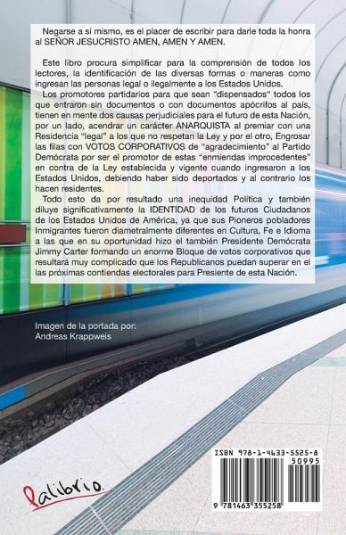 Este libro procura simplificar para la comprensión de todos los lectores, la identificación de las diversas formas o maneras como ingresan las personas legal o ilegalmente a los Estados Unidos. Los promotores partidarios para que sean "dispensados" todos los que entraron sin documentos o con documentos apócrifos al país, tienen en mente dos causas perjudiciales para el futuro de esta Nación, por un lado, acendrar un carácter ANARQUISTA al premiar con una Residencia "legal" a los que no respetan la Ley y por el otro, Engrosar las filas con VOTOS CORPORATIVOS de "agradecimiento" al Partido Demócrata por ser el promotor de estas "enmiendas improcedentes" en contra de la Ley establecida y vigente cuando ingresaron a los Estados Unidos, debiendo haber sido deportados y al contrario los hacen residentes. Todo esto da por resultado una inequidad Política y también diluye significativamente la IDENTIDAD de los futuros Ciudadanos de los Estados Unidos de América, ya que sus Pioneros pobladores Inmigrantes fueron diametralmente diferentes en Cultura, Fe e Idioma a las que en su oportunidad hizo el también Presidente Demócrata Jimmy Carter formando un enorme Bloque de votos corporativos que resultará muy complicado que los Republicanos puedan superar en el las próximas contiendas electorales para Presiente de esta Nación.
