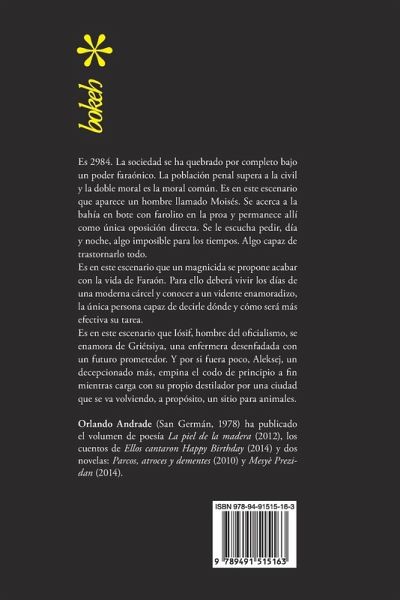 Es 2984. La sociedad se ha quebrado por completo bajo un poder faraónico. La población penal supera a la civil y la doble moral es la moral común. La gente usa nombres de guerra para evitar sus verdaderas personalidades. Los cazadores acosan a los ciudadanos para limar cualquier aspereza política. Es en este escenario que aparece un hombre llamado Moisés. Viene con un mensaje incomprensible, a la usanza del antiguo profeta. Se acerca a la bahía en bote con farolito en la proa y permanece allí como única oposición directa. Se le escucha pedir, día y noche, algo imposible para los tiempos. Algo capaz de trastornarlo todo. Es en este escenario que un magnicida se propone acabar con la vida de Faraón. Para ello deberá vivir los días de una moderna cárcel y conocer a un vidente enamoradizo, la única persona capaz de decirle dónde y cómo será más efectiva su tarea. Es en este escenario que Iósif, hombre del oficialismo, se enamora de Griétsiya, una enfermera desenfadada con un futuro prometedor. Y por si fuera poco, Aleksej, un decepcionado más, empina el codo de principio a fin mientras carga con su propio destilador por una ciudad que se va volviendo, a propósito, un sitio para animales. Orlando Andrade (San Germán, 1978) ha publicado el volumen de poesía La piel de la madera (2012), los cuentos de Ellos cantaron Happy Birthday (2014) y dos novelas: Parcos, atroces y dementes (2010) y Mesyè Prezidan (2014).