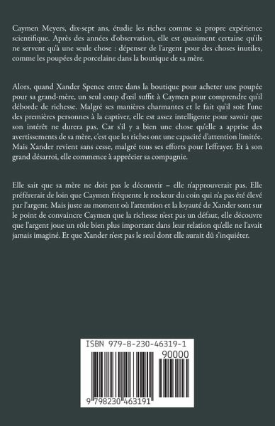 Caymen Meyers, dix-sept ans, étudie les riches comme sa propre expérience scientifique. Après des années d'observation, elle est quasiment certaine qu'ils ne servent qu'à une seule chose : dépenser de l'argent pour des choses inutiles, comme les poupées de porcelaine dans la boutique de sa mère. Alors, quand Xander Spence entre dans la boutique pour acheter une poupée pour sa grand-mère, un seul coup d'il suffit à Caymen pour comprendre qu'il déborde de richesse. Malgré ses manières charmantes et le fait qu'il soit l'une des premières personnes à la captiver, elle est assez intelligente pour savoir que son intérêt ne durera pas. Car s'il y a bien une chose qu'elle a apprise des avertissements de sa mère, c'est que les riches ont une capacité d'attention limitée. Mais Xander revient sans cesse, malgré tous ses efforts pour l'effrayer. Et à son grand désarroi, elle commence à apprécier sa compagnie. Elle sait que sa mère ne doit pas le découvrir - elle n'approuverait pas. Elle préférerait de loin que Caymen fréquente le rockeur du coin qui n'a pas été élevé par l'argent. Mais juste au moment où l'attention et la loyauté de Xander sont sur le point de convaincre Caymen que la richesse n'est pas un défaut, elle découvre que l'argent joue un rôle bien plus important dans leur relation qu'elle ne l'avait jamais imaginé. Et que Xander n'est pas le seul dont elle aurait dû s'inquiéter.