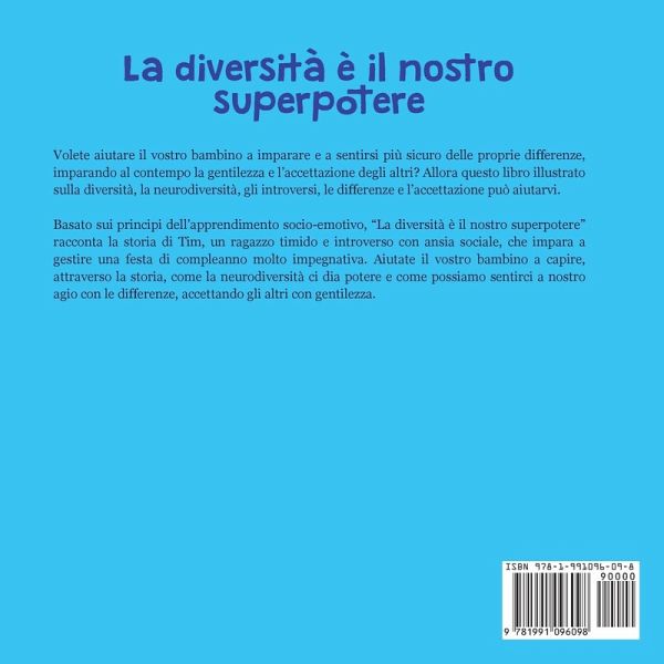 Volete aiutare il vostro bambino a imparare e a sentirsi più sicuro delle proprie differenze, imparando al contempo la gentilezza e l'accettazione degli altri? Allora questo libro illustrato sulla diversità, la neurodiversità, gli introversi, le differenze e l'accettazione può aiutarvi. Basato sui principi dell'apprendimento socio-emotivo, "La diversità è il nostro superpotere" racconta la storia di Tim, un ragazzo timido e introverso con ansia sociale, che impara a gestire una festa di compleanno molto impegnativa. Aiutate il vostro bambino a capire, attraverso la storia, come la neurodiversità ci dia potere e come possiamo sentirci a nostro agio con le differenze, accettando gli altri con gentilezza. "La diversità è il nostro superpotere" può aiutare i vostri figli a:Sentirsi più sicuri delle proprie differenze e della propria neurodiversità; Gestire l'energia e le emozioni; Essere consapevoli della natura introversa; Essere gentili con gli altri che sono diversi; Essere più sicuri di sé; Amare e accettare sé stessi per quello che sono: Celebrare e accettare la diversità Acquistate subito questo libro e aiutate il vostro bambino a imparare oggi stesso.