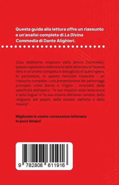 Cosa dobbiamo imparare dalla Divina Commedia, questo capolavoro della storia della letteratura? Questo libro è un'analisi completa e dettagliata di quest'opera. In particolare, in questo fascicolo troverete - Un riassunto completo - Una presentazione dei personaggi principali come Dante o Virgilio - Un'analisi delle specificità dell'opera: il suo impatto sulla letteratura e sulla lingua, la sua visione dell'amor cortese, della religione, dei popoli, della società, dell'arte e della musica Un'analisi dei riferimenti per comprendere rapidamente il significato dell'opera.