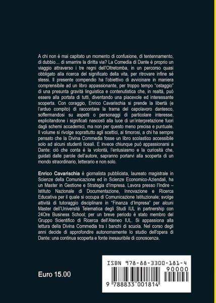 A chi non è mai capitato un momento di confusione, di tentennamento, di dubbio... di smarrire la diritta via? Agli inizi del 1300 deve essere successo anche ad un giovane uomo, nel pieno dei trambusti della sua epoca (e della sua vita), che tutti noi conosciamo come il Sommo Poeta: stiamo parlando di Dante Alighieri. La sua Comedìa - o, come è più comunemente nota, Divina Commedia - è proprio questo, un viaggio (con delle guide d'eccezione) attraverso i tre regni dell'Oltretomba, in un percorso quasi obbligato alla ricerca del significato della vita, per ritrovare infine sé stessi. Siamo tutti, in fondo, protagonisti di questo racconto: la Divina Commedia è uno specchio che riflette la nostra immagine più intima e ci indica la strada per il coraggio, il cui segreto è la libertà. Questo breve ed umile - ma non per questo meno valente - compendio ha l'obiettivo di avvicinare in maniera comprensibile e affascinante ad un libro appassionante, per troppo tempo "ostaggio" di una presunta gravità linguistica e contenutistica che, in realtà, può essere alla portata di tutti, diventando una piacevole ed interessante scoperta. Con coraggio, Enrico Cavarischia si prende la libertà (e l'arduo compito) di raccontare la trama del capolavoro dantesco, soffermandosi su aspetti o personaggi di particolare interesse, esplicitando i significati nascosti alla luce di un'interpretazione fuori dagli schemi accademici, ma non per questo meno precisa e puntuale. Paura, umorismo, tenerezza: la Commedia è la summa di tutte le letterature, dall'horror al comico, dal thriller al sentimentale. Ce n'è per tutti i gusti: è, infatti, un libro avvincente, una storia di amicizia (quella tra Dante e Virgilio su tutte) e di amore, di santi e peccatori; è un'avventura che si snoda tra incontri con esseri mitologici grotteschi, angeli splendenti, demòni minacciosi, in situazioni paradossali ma in fondo riflesso delle nostre paure ed angosce. Il volume si rivolge soprattutto agli scettici, ai timorosi, a chi ha sempre pensato che la Divina Commedia fosse un libro scolastico accessibile solo ad alcuni studenti liceali. E invece chiunque può appassionarsi a Dante, anche quelli che navigano in una piccioletta barca e non hanno particolari competenze filosofiche e teologiche: ciò che conta è la volontà, l'entusiasmo e la curiosità che, guidati dalle parole dell'autore, sapranno portarvi alla scoperta di un mondo straordinario, letterario e non solo. Fatti non foste a viver come bruti ma per seguir virtute e canoscenza, perciò... Buona lettura!