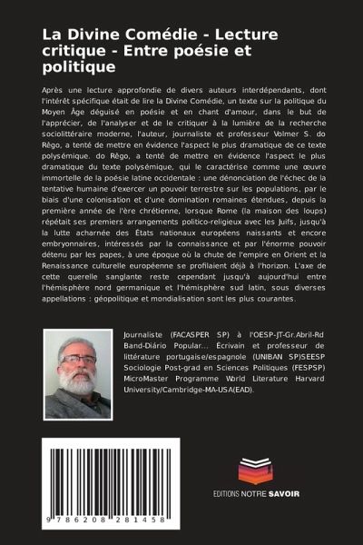 Après une lecture approfondie de divers auteurs interdépendants, dont l'intérêt spécifique était de lire la Divine Comédie, un texte sur la politique du Moyen Âge déguisé en poésie et en chant d'amour, dans le but de l'apprécier, de l'analyser et de le critiquer à la lumière de la recherche sociolittéraire moderne, l'auteur, journaliste et professeur Volmer S. do Rêgo, a tenté de mettre en évidence l'aspect le plus dramatique de ce texte polysémique. do Rêgo, a tenté de mettre en évidence l'aspect le plus dramatique du texte polysémique, qui le caractérise comme une oeuvre immortelle de la poésie latine occidentale : une dénonciation de l'échec de la tentative humaine d'exercer un pouvoir terrestre sur les populations, par le biais d'une colonisation et d'une domination romaines étendues, depuis la première année de l'ère chrétienne, lorsque Rome (la maison des loups) répétait ses premiers arrangements politico-religieux avec les Juifs, jusqu'à la lutte acharnée des États nationaux européens naissants et encore embryonnaires, intéressés par la connaissance et par l'énorme pouvoir détenu par les papes, à une époque où la chute de l'empire en Orient et la Renaissance culturelle européenne se profilaient déjà à l'horizon. L'axe de cette querelle sanglante reste cependant jusqu'à aujourd'hui entre l'hémisphère nord germanique et l'hémisphère sud latin, sous diverses appellations : géopolitique et mondialisation sont les plus courantes.
