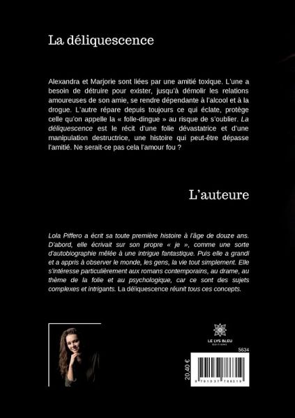 Alexandra et Marjorie sont liées par une amitié toxique. L'une a besoin de détruire pour exister, jusqu'à démolir les relations amoureuses de son amie, se rendre dépendante à l'alcool et à la drogue. L'autre répare depuis toujours ce qui éclate, protège celle qu'on appelle la folle-dingue au risque de s'oublier. La déliquescence est le récit d'une folie dévastatrice et d'une manipulation destructrice, une histoire qui peut-être dépasse l'amitié. Ne serait-ce pas cela l'amour fou ?