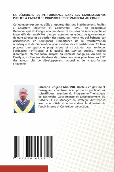 LA DÉMARCHE DE PERFORMANCE DANS LES ÉTABLISSEMENTS PUBLICS À CARACTÈRE INDUSTRIEL ET COMMERCIAL AU CONGO Cet ouvrage explore les défis et opportunités des Établissements Publics à Caractère Industriel et Commercial (EPIC) en République Démocratique du Congo, à la croisée entre missions de service public et impératifs de rentabilité. L'auteur examine les enjeux de gouvernance, de transparence et de gestion des ressources humaines qui freinent leur performance, en soulignant l'importance de la transformation numérique et de l'innovation pour moderniser ces institutions. Ce livre propose une approche pragmatique et structurée pour renforcer l'efficacité, l'efficience et la qualité des services publics, inspirée d'exemples internationaux adaptés au contexte congolais. Au-delà de l'analyse, il offre aux décideurs des pistes concrètes pour faire des EPIC des acteurs clés du développement national et de la satisfaction citoyenne.
