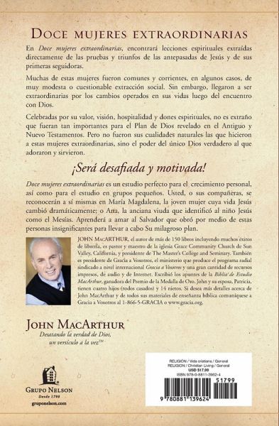 Eran personas ordinarias, comunes y en algunos casos de baja de casta, pero a pesar de eso cada una de ellas se convirit¿¿ en una persona extraordinaria luego de un encuentro transformador con Dios. Los lectores ser¿¿n desafiados y motivados por Doce mujeres extraordinarias, un recuento conmovedor y personal de la vida de algunas de las mujeres m¿¿s fieles de la Biblia. Sus luchas y tentaciones son las mismas pruebas que enfrentan todos los creyentes de todas las edades. En este libro, el autor best seller y maestro de la Biblia John MacArthur demuestra que el Dios con quien estas mujeres estuvieron tan fielmente comprometidas es el mismo Dios que contin¿¿a moldeando y utilizando a la gente com¿¿n hoy en d¿¿a. Estudie junto con el autor best seller, John MacArthur las vidas y la fe de mujeres importantes del Antiguo y Nuevo Testamento. Escrito con el mismo estilo que us¿¿ en el libro Doce hombres comunes y corrientes, cada cap¿¿tulo incluye un resumen biogr¿¿fico de cada mujer y la lecci¿¿n espiritual que se extrae de su vida.