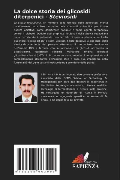 La Stevia rebaudiana, un membro della famiglia delle asteracee, merita un'attenzione particolare da parte della comunità scientifica per il suo duplice obiettivo: come dolcificante naturale e come agente terapeutico contro il diabete. Queste due proprietà funzionali della Stevia rebaudiana hanno accelerato il potenziale commerciale di questa pianta a un livello superiore rispetto ad altri sistemi vegetali. Il libro descrive la biosintesi dello stevioside che inizia dal piruvato attraverso il meccanismo enzimatico dell'enzima DXS e termina con la formazione di glicosidi attraverso la glicosilazione, utilizzando l'enzima marcatore Uridina difosfato glicosiltransferasi (UGT). Il libro apre un nuovo mondo di comprensione sul comportamento strutturale dell'enzima UGT e sulla sua importanza nella funzionalità del gene verso il metabolismo secondario della pianta.
