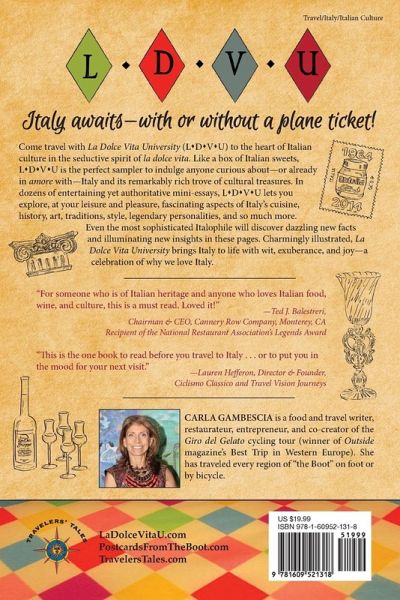 Like a box of Italian sweets, La Dolce Vita University (LDVU) is the perfect sampler for anyone curious about (or already in amore with) Italy and its remarkably rich cultural gifts. The 165 mini-essays, arranged alphabetically and accompanied by charming illustrations throughout, treat specific topics in one or more of the following subject areas: the Italian character; the visual arts (art, artists, architects); the performing arts (music, theater, cinema); history and antiquity; language and literature; cuisine and agriculture; wine and spirits; traditions and festivals; style and applied arts; unique places. La Dolce Vita University is more than a reference book: it¿s a must-read for every Italophile (in the U.S., U.K. and the world over!) a perfect gift book, a compendium, a gallimaufry, a unique companion guide to Italy.