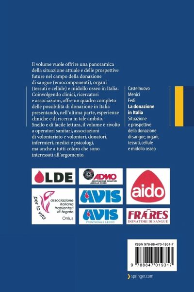 Il volume vuole offrire una panoramica della situazione attuale e delle prospettive future nel campo della donazione di sangue (emocomponenti), organi (tessuti e cellule) e midollo osseo in Italia. Coinvolgendo clinici, ricercatori e associazioni, offre un quadro completo delle possibilità di donazione in Italia presentando, nell ultima parte, esperienze cliniche e di ricerca in tale ambito. Snello e di facile lettura, il volume è rivolto a operatori sanitari, associazioni di volontariato e volontari, donatori, infermieri, medici e psicologi, ma anche a tutti coloro che sono interessati all argomento.