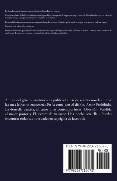La doncella cautiva-saga de romance erótico medieval. Primera entrega. Camino a su boda, Isabella Manfredi es rapatada por el hijo primogénito de su peor enemigo: Enrico Golfieri y llevada contra su voluntad al castillo sin que nadie pueda salvarla de convertirse en su cautiva. La joven luchará por escapar pero sabe que acaba de perder su honor y lo único que le queda es aceptar casarse con su malvado raptor. Muy contra su voluntad por supuesto. Pero su temible enemigo no puede evitar sucumbir de deseo por la bella joven de dorada caballera: su doncella cautiva y será el comienzo de una historia de amor que perdurará a pesar del odio y la enemistad de sus familias.