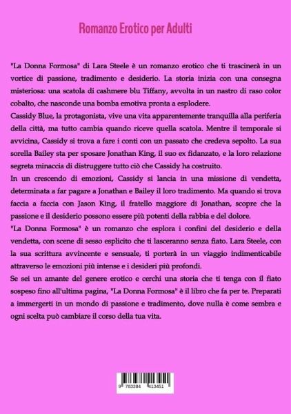 "La Donna Formosa" di Lara Steele è un romanzo erotico che ti trascinerà in un vortice di passione, tradimento e desiderio. La storia inizia con una consegna misteriosa: una scatola di cashmere blu Tiffany, avvolta in un nastro di raso color cobalto, che nasconde una bomba emotiva pronta a esplodere.Cassidy Blue, la protagonista, vive una vita apparentemente tranquilla alla periferia della città, ma tutto cambia quando riceve quella scatola. Mentre il temporale si avvicina, Cassidy si trova a fare i conti con un passato che credeva sepolto. La sua sorella Bailey sta per sposare Jonathan King, il suo ex fidanzato, e la loro relazione segreta minaccia di distruggere tutto ciò che Cassidy ha costruito.In un crescendo di emozioni, Cassidy si lancia in una missione di vendetta, determinata a far pagare a Jonathan e Bailey il loro tradimento. Ma quando si trova faccia a faccia con Jason King, il fratello maggiore di Jonathan, scopre che la passione e il desiderio possono essere più potenti della rabbia e del dolore."La Donna Formosa" è un romanzo che esplora i confini del desiderio e della vendetta, con scene di sesso esplicito che ti lasceranno senza fiato. Lara Steele, con la sua scrittura avvincente e sensuale, ti porterà in un viaggio indimenticabile attraverso le emozioni più intense e i desideri più profondi.Se sei un amante del genere erotico e cerchi una storia che ti tenga con il fiato sospeso fino all'ultima pagina, "La Donna Formosa" è il libro che fa per te. Preparati a immergerti in un mondo di passione e tradimento, dove nulla è come sembra e ogni scelta può cambiare il corso della tua vita.