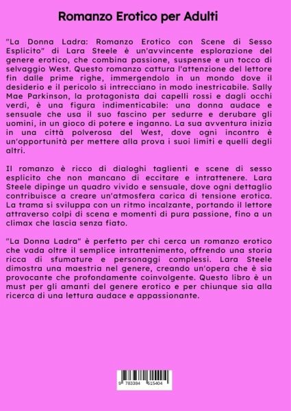 "La Donna Ladra: Romanzo Erotico con Scene di Sesso Esplicito" di Lara Steele è un'avvincente esplorazione del genere erotico, che combina passione, suspense e un tocco di selvaggio West. Questo romanzo cattura l'attenzione del lettore fin dalle prime righe, immergendolo in un mondo dove il desiderio e il pericolo si intrecciano in modo inestricabile. Sally Mae Parkinson, la protagonista dai capelli rossi e dagli occhi verdi, è una figura indimenticabile: una donna audace e sensuale che usa il suo fascino per sedurre e derubare gli uomini, in un gioco di potere e inganno. La sua avventura inizia in una città polverosa del West, dove ogni incontro è un'opportunità per mettere alla prova i suoi limiti e quelli degli altri.Il romanzo è ricco di dialoghi taglienti e scene di sesso esplicito che non mancano di eccitare e intrattenere. Lara Steele dipinge un quadro vivido e sensuale, dove ogni dettaglio contribuisce a creare un'atmosfera carica di tensione erotica. La trama si sviluppacon un ritmo incalzante, portando il lettore attraverso colpi di scena e momenti di pura passione, fino a un climax che lascia senza fiato."La Donna Ladra" è perfetto per chi cerca un romanzo erotico che vada oltre il semplice intrattenimento, offrendo una storia ricca di sfumature e personaggi complessi. Lara Steele dimostra una maestria nel genere, creando un'opera che è sia provocante che profondamente coinvolgente. Questo libro è un must per gli amanti del genere erotico e per chiunque sia alla ricerca di una lettura audace e appassionante.