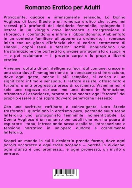 Provocante, audace e intensamente sensuale, La Donna Vogliosa di Lara Steele è un romanzo erotico che scava nei recessi più profondi del desiderio femminile, spingendo il lettore in un viaggio dove innocenza e trasgressione si sfiorano, si confondono e infine si abbandonano. Ambientato in un contesto familiare all'apparenza ordinario, il romanzo inizia con un gioco d'infanzia che si carica lentamente di simboli, doppi sensi e tensioni sottili, annunciando una trasformazione che porterà la giovane protagonista a scoprire - e poi reclamare - il proprio corpo e la propria libertà erotica.Vivienne, dotata di un'intelligenza fuori dal comune, cresce in una casa dove l'immaginazione e la conoscenza si intrecciano, dove ogni gesto, anche il più semplice, si carica di un significato intimo e sensuale. Il lettore assiste, affascinato e turbato, a una progressiva presa di coscienza: Vivienne non è solo una ragazza curiosa, ma una donna in formazione, affamata di esperienze, pronta a spalancare ogni "stanza" del proprio essere a chi saprà davvero penetrarne l'essenza.Con una scrittura raffinata e coinvolgente, Lara Steele trasforma il quotidiano in erotismo puro, portando sulla scena letteraria una protagonista femminile indimenticabile: La Donna Vogliosa è un romanzo per adulti che non ha paura di esplorare i tabù, intrecciando sesso esplicito, introspezione e tensione narrativa in un'opera audace e carnalmente letteraria.Scopri un mondo in cui il desiderio prende forma, dove ogni parola accarezza e ogni frase accende - perché in Vivienne, ogni stanza è una promessa... e ogni promessa, un invito a entrare.