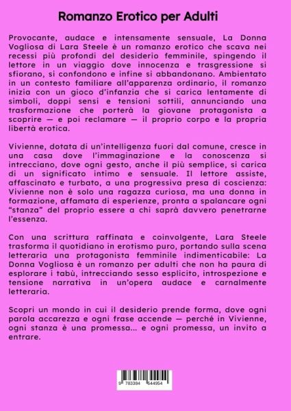 Provocante, audace e intensamente sensuale, La Donna Vogliosa di Lara Steele è un romanzo erotico che scava nei recessi più profondi del desiderio femminile, spingendo il lettore in un viaggio dove innocenza e trasgressione si sfiorano, si confondono e infine si abbandonano. Ambientato in un contesto familiare all'apparenza ordinario, il romanzo inizia con un gioco d'infanzia che si carica lentamente di simboli, doppi sensi e tensioni sottili, annunciando una trasformazione che porterà la giovane protagonista a scoprire - e poi reclamare - il proprio corpo e la propria libertà erotica.Vivienne, dotata di un'intelligenza fuori dal comune, cresce in una casa dove l'immaginazione e la conoscenza si intrecciano, dove ogni gesto, anche il più semplice, si carica di un significato intimo e sensuale. Il lettore assiste, affascinato e turbato, a una progressiva presa di coscienza: Vivienne non è solo una ragazza curiosa, ma una donna in formazione, affamata di esperienze, pronta a spalancare ogni "stanza" del proprio essere a chi saprà davvero penetrarne l'essenza.Con una scrittura raffinata e coinvolgente, Lara Steele trasforma il quotidiano in erotismo puro, portando sulla scena letteraria una protagonista femminile indimenticabile: La Donna Vogliosa è un romanzo per adulti che non ha paura di esplorare i tabù, intrecciando sesso esplicito, introspezione e tensione narrativa in un'opera audace e carnalmente letteraria.Scopri un mondo in cui il desiderio prende forma, dove ogni parola accarezza e ogni frase accende - perché in Vivienne, ogni stanza è una promessa... e ogni promessa, un invito a entrare.