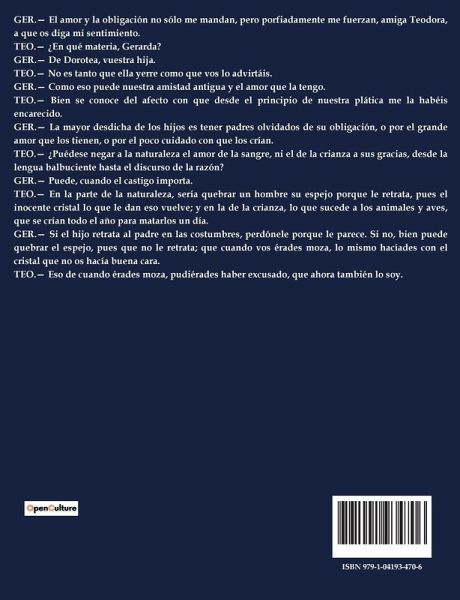 GER.¿ El amor y la obligación no sólo me mandan, pero porfiadamente me fuerzan, amiga Teodora, a que os diga mi sentimiento. TEO.¿ ¿En qué materia, Gerarda? GER.¿ De Dorotea, vuestra hija. TEO.¿ No es tanto que ella yerre como que vos lo advirtáis. GER.¿ Como eso puede nuestra amistad antigua y el amor que la tengo. TEO.¿ Bien se conoce del afecto con que desde el principio de nuestra plática me la habéis encarecido. GER.¿ La mayor desdicha de los hijos es tener padres olvidados de su obligación, o por el grande amor que los tienen, o por el poco cuidado con que los crían. TEO.¿ ¿Puédese negar…mehr