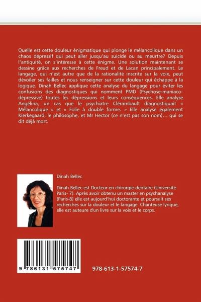 Quelle est cette douleur énigmatique qui plonge le mélancolique dans un chaos dépressif qui peut aller jusqu'au suicide ou au meurtre? Depuis l'antiquité, on s'intéresse à cette énigme. Une solution maintenant se dessine grâce aux recherches de Freud et de Lacan principalement. Le langage, qui n'est autre que de la rationalité inscrite sur la voix, peut dévoiler ses failles et nous renseigner sur cette douleur qui échappe à la logique. Dinah Bellec applique cette analyse du langage pour éviter les confusions des diagnostiques qui nomment PMD (Psychose-maniaco-dépressive) toutes les dépressions et leurs conséquences. Elle analyse Angélina, un cas que le psychiatre Clérambault diagnostiquait " Mélancolique " et " Folie à double forme. " Elle analyse également Kierkegaard, le philosophe, et Mr Hector (ce n'est pas son nom) qui se dit déjà mort.