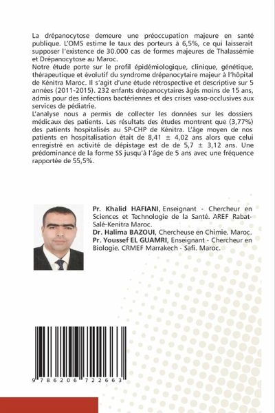 La drépanocytose demeure une préoccupation majeure en santé publique. L'OMS estime le taux des porteurs à 6,5%, ce qui laisserait supposer l'existence de 30.000 cas de formes majeures de Thalassémie et Drépanocytose au Maroc. Notre étude porte sur le profil épidémiologique, clinique, génétique, thérapeutique et évolutif du syndrome drépanocytaire majeur à l'hôpital de Kénitra Maroc. Il s'agit d'une étude rétrospective et descriptive sur 5 années (2011-2015). 232 enfants drépanocytaires âgés moins de 15 ans, admis pour des infections bactériennes et des crises vaso-occlusives aux services de pédiatrie.L'analyse nous a permis de collecter les données sur les dossiers médicaux des patients. Les résultats des études montrent que (3,77%) des patients hospitalisés au SP-CHP de Kénitra. L'âge moyen de nos patients en hospitalisation était de 8,41 ± 4,02 ans alors que celui enregistré en activité de dépistage est de de 5,7 ± 3,12 ans. Une prédominance de la forme SS jusqu'à l'âge de 5 ans avec une fréquence rapportée de 55,5%.