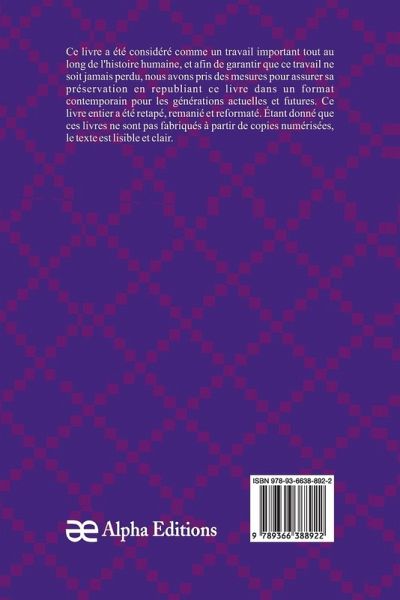 La Duchesse De Palliano" est un livre classique, qui a eu une valeur significative tout au long de l'histoire, et pour garantir que sa sagesse intemporelle ne soit jamais perdue, Alpha Editions l'a soigneusement préservé en le republiant dans un format moderne et accessible aux générations présentes et futures. Soigneusement reformaté, retapé , et nouvellement conçue, cette édition offre un texte clair et lisible, sans copies numérisées de l'uvre originale, Alpha Editions se consacre à insuffler une nouvelle vie aux livres anciens et classiques, rendant ces trésors littéraires à nouveau disponibles pour les lecteurs qui chérissent l'histoire. culture et savoir intemporel.