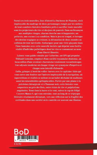 Parmi ces trois nouvelles, lisez d'abord La Duchesse de Planoise, récit impitoyable du naufrage de deux personnages rongés par les ombres de leurs sombres histoires familiales prêts à sacrifier toute moralité sous les projecteurs du vice et des jeux de pouvoir. Dans un Besançon aux multiples visages, chacun cherche une échappatoire, un prétexte, une excuse à sa condition. Mais le jeu est truqué, et lorsque des destins tragiques se croisent, la détonation de deux mondes en collision devient inévitable. Embarquez pour une virée glaçante dans l'âme humaine avec cette nouvelle incisive qui dépeint sans fard la réalité d'individus pathétiques dont les vies se consument au nom d'une liberté illusoire. Laissez-vous guider ensuite par Catherine, un GPS qui propulse Thibault Lemoine, employé d'une société royannaise douteuse, au beau milieu d'une aventure charentaise totalement rocambolesque. Une odyssée moderne où chaque virage est synonyme d'imprévu et chaque sens interdit d'absurde. Enfin, grimpez à bord du voilier Aurora avec le capitaine Alain qui vous ouvre une fenêtre sur l'univers impitoyable de la navigation, où superstitions et réalités se mêlent en un ballet déchaîné de malheurs aussi invraisemblables qu'implacables. Portée par une plume à la précision chirurgicale et à l'humour noir, cette histoire vous emportera au grès des flots, entre éclats de rire et palpitations angoissées. Tenez bon la barre et le vent, suivez le cap de Félipé Caceres Munoz S. qui vous entraîne, tout au long de ce triptyque littéraire résolument déroutant, vers une réflexion sur la fragilité des certitudes dans une société où le contrôle est souvent une illusion.