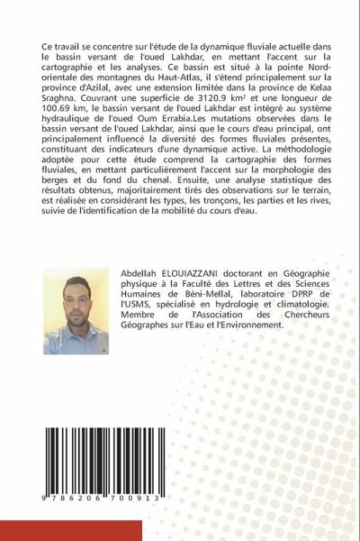 Ce travail se concentre sur l'étude de la dynamique fluviale actuelle dans le bassin versant de l'oued Lakhdar, en mettant l'accent sur la cartographie et les analyses. Ce bassin est situé à la pointe Nord-orientale des montagnes du Haut-Atlas, il s'étend principalement sur la province d'Azilal, avec une extension limitée dans la province de Kelaa Sraghna. Couvrant une superficie de 3120.9 km² et une longueur de 100.69 km, le bassin versant de l'oued Lakhdar est intégré au système hydraulique de l'oued Oum Errabia.Les mutations observées dans le bassin versant de l'oued Lakhdar, ainsi que le cours d'eau principal, ont principalement influencé la diversité des formes fluviales présentes, constituant des indicateurs d'une dynamique active. La méthodologie adoptée pour cette étude comprend la cartographie des formes fluviales, en mettant particulièrement l'accent sur la morphologie des berges et du fond du chenal. Ensuite, une analyse statistique des résultats obtenus, majoritairement tirés des observations sur le terrain, est réalisée en considérant les types, les tronçons, les parties et les rives, suivie de l'identification de la mobilité du cours d'eau.