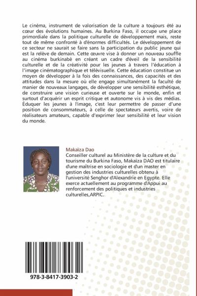 Le cinéma, instrument de valorisation de la culture a toujours été au c ur des évolutions humaines. Au Burkina Faso, il occupe une place primordiale dans la politique culturelle de développement mais, reste tout de même confronté à d'énormes difficultés. Le développement de ce secteur ne saurait se faire sans la participation du public jeune qui est la relève de demain. Cette uvre vise à donner un nouveau souffle au cinéma burkinabè en créant un cadre d'éveil de la sensibilité culturelle et de la créativité pour les jeunes à travers l éducation à l image cinématographique et télévisuelle. Cette éducation constitue un moyen de développer à la fois des connaissances, des capacités et des attitudes dans la mesure où elle engage simultanément la faculté de manier de nouveaux langages, de développer une sensibilité esthétique, de construire une vision curieuse et ouverte sur le monde, enfin et surtout d acquérir un esprit critique et autonome vis à vis des médias. Éduquer les jeunes à l'image, c'est leur permettre de passer d une position de consommateurs, à celle de spectateurs avertis, voire de réalisateurs amateurs, capable d exprimer leur sensibilité et leur vision du monde.