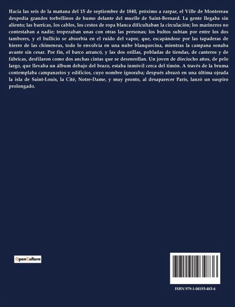 Hacia las seis de la mañana del 15 de septiembre de 1840, próximo a zarpar, el Ville de Montereau despedía grandes torbellinos de humo delante del muelle de Saint-Bernard. La gente llegaba sin aliento; las barricas, los cables, los cestos de ropa blanca dificultaban la circulación; los marineros no contestaban a nadie; tropezaban unas con otras las personas; los bultos subían por entre los dos tambores, y el bullicio se absorbía en el ruido del vapor, que, escapándose por las tapaderas de hierro de las chimeneas, todo lo envolvía en una nube blanquecina, mientras la campana sonaba avante sin cesar. Por fin, el barco arrancó, y las dos orillas, pobladas de tiendas, de canteros y de fábricas, desfilaron como dos anchas cintas que se desenrollan. Un joven de dieciocho años, de pelo largo, que llevaba un álbum debajo del brazo, estaba inmóvil cerca del timón. A través de la bruma contemplaba campanarios y edificios, cuyo nombre ignoraba; después abrazó en una última ojeada la isla de Saint-Louis, la Cité, Notre-Dame, y muy pronto, al desaparecer París, lanzó un suspiro prolongado.