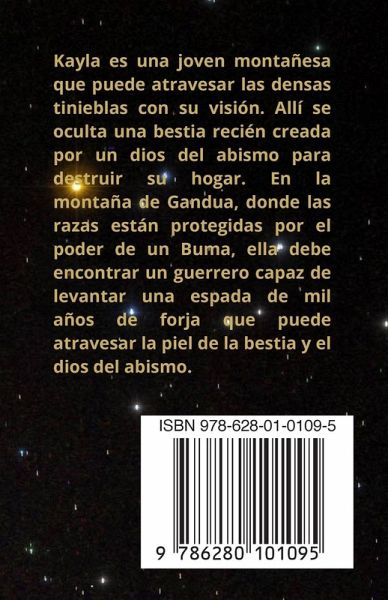 Kayla es una joven montañesa que puede atravesar las densas tinieblas con su visión donde se oculta una bestia recién creada por un dios del abismo para destruir su hogar. En la montaña de Gandua, donde las razas están protegidas por el poder de un Buma, ella debe encontrar un guerrero capaz de levantar una espada de mil años de forja que puede atravesar la piel de la bestia y el dios del abismo.