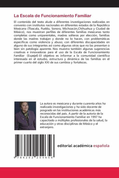 El contenido del texto alude a diferentes investigaciones realizadas en convenio con institutos nacionales en diferentes estados de la República Mexicana (Tlaxcala, Puebla, Sonora, Michoacán,Chihuahua y Ciudad de México), nos muestran perfiles de diferentes familias mexicanas tanto completas como uniparentales, madres solteras por elección, familias donde las madres trabajan y donde no lo hacen, con problemáticas especificas como violencia y abuso; con diferentes discapacidades en alguno de sus integrantes así como algunas otras que no las presentan o bien sin patología aparente. Nos muestra también algunas sugerencias creativas e innovadoras para el uso de la Escala de Funcionamiento Familiar (Espejel) El objetivo es informar a la comunidad científica interesada en el estudio, estructura y dinámica de las familias en el primer cuarto del siglo XXI de sus cambios y fortalezas.