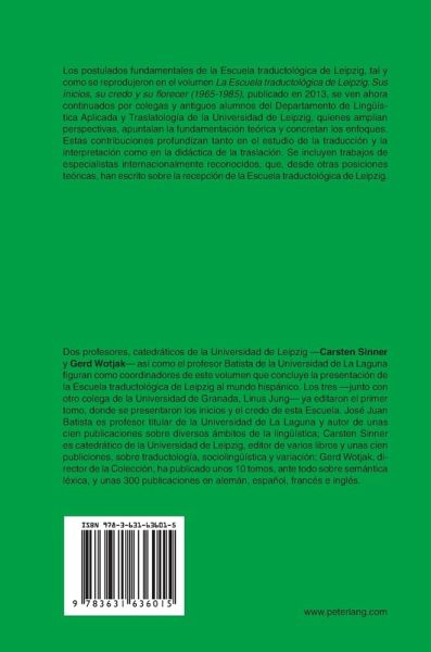 Los postulados fundamentales de la Escuela traductológica de Leipzig, tal y como se reprodujeron en el volumen La Escuela traductológica de Leipzig. Sus inicios, su credo y su florecer (1965-1985), publicado en 2013, se ven ahora continuados por colegas y antiguos alumnos del Departamento de Lingüística Aplicada y Traslatología de la Universidad de Leipzig, quienes amplian perspectivas, apuntalan la fundamentación teórica y concretan los enfoques. Estas contribuciones profundizan tanto en el estudio de la traducción y la interpretación como en la didáctica de la traslación. Se incluyen trabajos de especialistas internacionalmente reconocidos, que, desde otras posiciones teóricas, han escrito sobre la recepción de la Escuela traductológica de Leipzig.