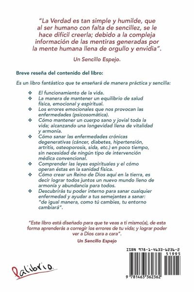 Es un libro fantástico que te enseñará de manera práctica y sencilla: ¿ El funcionamiento de la vida. ¿ La manera de mantener un equilibrio de salud física, emocional y espiritual. ¿ Los errores emocionales que nos provocan las enfermedades (psicosomática). ¿ Cómo mantener un cuerpo sano y jovial toda la vida; alcanzando una longevidad llena de vitalidad y armonía. ¿ Cómo sanar las enfermedades crónicas degenerativas (cáncer, diabetes, hipertensión, artritis, osteoporosis, sida, etc.) en poco tiempo, sin necesidad de ningún tipo de intervención médica convencional. ¿ Comprender las leyes espirituales y el cómo operan éstas en la sanidad física. ¿ Cómo crear un Reino de Dios aquí en la tierra, es decir lograr todos juntos un nuevo mundo lleno de armonía y abundancia para todos. ¿ Descubrirás tu poder interno para sanar cualquier enfermedad y ayudar a tus semejantes a sanar: "de igual manera, como tú cambies, tu entorno cambiará".