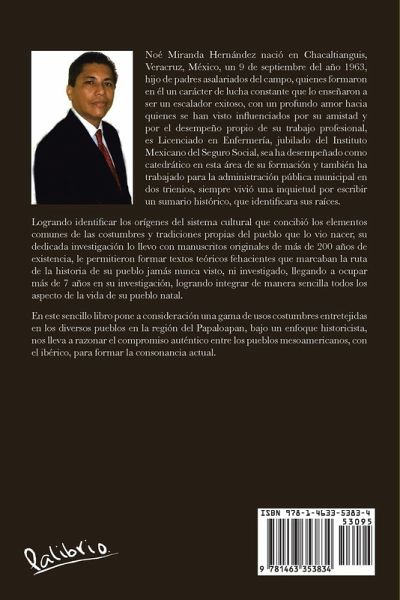 Noé Miranda Hernández nació en Chacaltianguis, Veracruz, México, un 9 de septiembre del año 1963, hijo de padres asalariados del campo, quienes formaron en él un carácter de lucha constante que lo enseñaron a ser un escalador exitoso, con un profundo amor hacia quienes se han visto influenciados por su amistad y por el desempeño propio de su trabajo profesional, es Licenciado en Enfermería, jubilado del Instituto Mexicano del Seguro Social, sea ha desempeñado como catedrático en esta área de su formación y también ha trabajado para la administración pública municipal en dos trienios, siempre vivió una inquietud por escribir un sumario histórico, que identificara sus raíces. Logrando identificar los orígenes del sistema cultural que concibió los elementos comunes de las costumbres y tradiciones propias del pueblo que lo vio nacer, su dedicada investigación lo llevo con manuscritos originales de más de 200 años de existencia, le permitieron formar textos teóricos fehacientes que marcaban la ruta de la historia de su pueblo jamás nunca visto, ni investigado, llegando a ocupar más de 7 años en su investigación, logrando integrar de manera sencilla todos los aspecto de la vida de su pueblo natal. En este sencillo libro pone a consideración una gama de usos costumbres entretejidas en los diversos pueblos en la región del Papaloapan, bajo un enfoque historicista, nos lleva a razonar el compromiso auténtico entre los pueblos mesoamericanos, con el ibérico, para formar la consonancia actual.