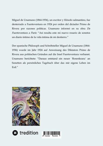 Hier findet sich eine Auswahl an Poemen und Tagebuchauszügen des Schriftstellers Miguel de Unamuno, die aus seinem Werk ´De Fuerteventura a París` stammen. Sie geben Zeugnis von seiner schweren Lebenssituation als Verbannter auf der Kanareninsel Fuerteventura im Jahr 1924, von dem dumpfen und ihn verzehrenden Warten ("Espera tupida") auf ein Ende seiner Gefangenschaft, aber auch von seiner Zugewandtheit zu den auf Fuerteventura lebenden einheimischen Menschen. Er ist fasziniert von der schroffen Wüstenlandschaft des kargen Eilands inmitten einer allmächtigen See und ist sich gleichzeitig bewusst, dass er am Verbannungsort nicht sein weiteres Leben fristen kann. Nach vier Monaten gelingt ihm die Flucht per Schiff und die Weiterreise nach Paris, wo ihm Asyl gewährt wird. Die Schriftstellerin Alissa Carpentier dichtete 18 seiner auf Fuerteventura verfassten Sonette in deutscher Sprache nach, übersetzte die ihnen zugeordneten Exzerpte aus den Tagebüchern und illustrierte den Band mit34 eigenen Federzeichnungen.