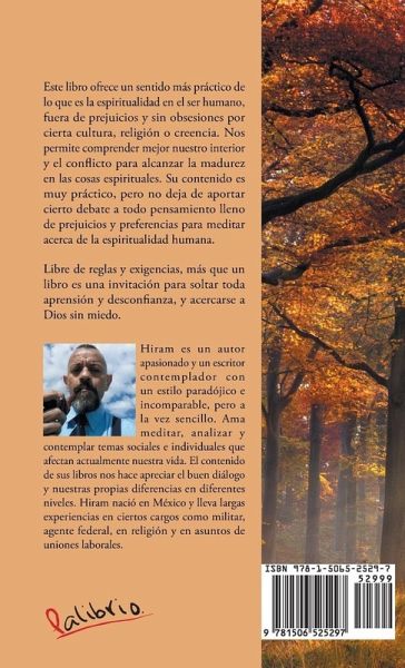 Este libro ofrece un sentido ms prctico de lo que es la espiritualidad en el ser humano, fuera de prejuicios y sin obsesiones por cierta cultura, religin o creencia. Nos permite comprender mejor nuestro interior y el conflicto para alcanzar la madurez en las cosas espirituales. Su contenido es muy prctico, pero no deja de aportar cierto debate a todo pensamiento lleno de prejuicios y preferencias para meditar acerca de la espiritualidad humana. Libre de reglas y exigencias, ms que un libro es una invitacin para soltar toda aprensin y desconfianza, y acercarse a Dios sin miedo.