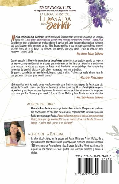 La Esposa de Pastor... Llamada Para Servir es un proyecto de colaboración de 52 esposas de pastores. Los devocionales de este libro están escritos especialmente para las esposas de pastor por esposas de pastor. Cada uno de los devocionales de este libro está escrito desde el corazón de cada esposa de pastor y serán de mucha bendición y ayuda a cada una que los lee y aplica a su vida. Muchos de nosotros hemos olvidado lo que significa ser esposa de pastor. Una esposa de pastor en ocasiones es criticada y mal entendida. También se desanima como cualquier otra persona. Es para ellas que se ha escrito este libro. Para ser de ánimo y de bendición a cada esposa de Pastor que lea este libro.
