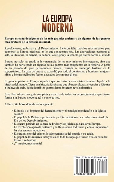 Europa es cuna de algunos de los más grandes artistas y de algunas de las guerras más brutales de la historia mundial. Revoluciones, reformas y el Renacimiento: hicieron falta muchos movimientos para convertir la Europa medieval en lo que conocemos hoy. Las aportaciones europeas al arte, la literatura, la ciencia, la cultura, la religión y la tecnología dieron forma al mundo. Europa no solo ha estado a la vanguardia de los movimientos intelectuales, sino que también ha participado en algunas de las guerras más sangrientas de la historia. A pesar de su periodo de gran pensamiento racional, Europa se sumergió bastante en lo supersticioso. La caza de brujas se extendió por todo el continente, y hombres, mujeres, niños e incluso pelirrojos fueron acusados de conjurar el mal. El gran impacto de Europa significa que su historia está intrínsecamente ligada a la historia del mundo. Tiene una historia fascinante que abarca culturas, creencias e idiomas e incluye de todo, desde horribles guerras hasta inventos revolucionarios. Este libro ofrece una guía completa y sencilla de todos los acontecimientos que dieron forma a la Europa moderna tal y como es hoy. Al leer este libro, descubrirá lo siguiente: El inicio y el impacto del Renacimiento y el consiguiente desafío a la Iglesia católica. El papel de la Reforma protestante y el Renacimiento en el advenimiento de la Era de los Descubrimientos. El oscuro período de la caza de brujas y los juicios que asolaron Europa. La revolución agrícola británica y la Revolución Industrial y cómo impulsaron las dos guerras mundiales. El surgimiento del primer Estado comunista del mundo y su caída. El papel de las mujeres influyentes en toda Europa que fueron vitales para dar forma a su historia. ¡Y mucho, mucho más!