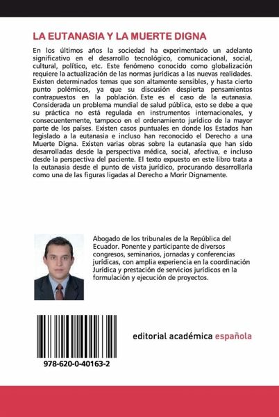 En los últimos años la sociedad ha experimentado un adelanto significativo en el desarrollo tecnológico, comunicacional, social, cultural, político, etc. Este fenómeno conocido como globalización requiere la actualización de las normas jurídicas a las nuevas realidades. Existen determinados temas que son altamente sensibles, y hasta cierto punto polémicos, ya que su discusión despierta pensamientos contrapuestos en la población. Este es el caso de la eutanasia. Considerada un problema mundial de salud pública, esto se debe a que su práctica no está regulada en instrumentos internacionales, y consecuentemente, tampoco en el ordenamiento jurídico de la mayor parte de los países. Existen casos puntuales en donde los Estados han legislado a la eutanasia e incluso han reconocido el Derecho a una Muerte Digna. Existen varias obras sobre la eutanasia que han sido desarrolladas desde la perspectiva médica, social, afectiva, e incluso desde la perspectiva del paciente. El texto expuesto en este libro trata a la eutanasia desde el punto de vista jurídico, procurando desarrollarla como una de las figuras ligadas al Derecho a Morir Dignamente.