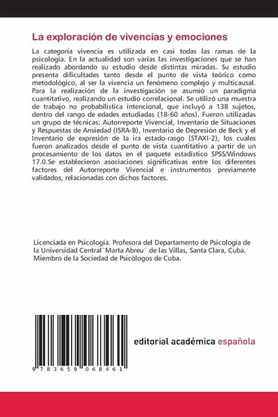 La categoría vivencia es utilizada en casi todas las ramas de la psicología. En la actualidad son varias las investigaciones que se han realizado abordando su estudio desde distintas miradas. Su estudio presenta dificultades tanto desde el punto de vista teórico como metodológico, al ser la vivencia un fenómeno complejo y multicausal. Para la realización de la investigación se asumió un paradigma cuantitativo, realizando un estudio correlacional. Se utilizó una muestra de trabajo no probabilística intencional, que incluyó a 138 sujetos, dentro del rango de edades estudiadas (18-60 años). Fueron utilizadas un grupo de técnicas: Autorreporte Vivencial, Inventario de Situaciones y Respuestas de Ansiedad (ISRA-B), Inventario de Depresión de Beck y el Inventario de expresión de la ira estado-rasgo (STAXI-2), los cuales fueron analizados desde el punto de vista cuantitativo a partir de un procesamiento de los datos en el paquete estadístico SPSS/Windows 17.0.Se establecieron asociaciones significativas entre los diferentes factores del Autorreporte Vivencial e instrumentos previamente validados, relacionadas con dichos factores.