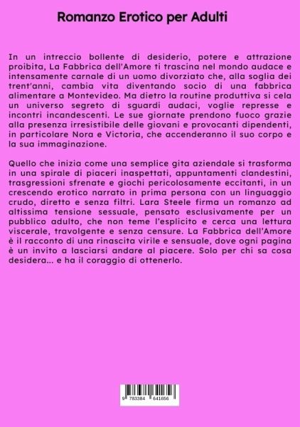 In un intreccio bollente di desiderio, potere e attrazione proibita, La Fabbrica dell'Amore ti trascina nel mondo audace e intensamente carnale di un uomo divorziato che, alla soglia dei trent'anni, cambia vita diventando socio di una fabbrica alimentare a Montevideo. Ma dietro la routine produttiva si cela un universo segreto di sguardi audaci, voglie represse e incontri incandescenti. Le sue giornate prendono fuoco grazie alla presenza irresistibile delle giovani e provocanti dipendenti, in particolare Nora e Victoria, che accenderanno il suo corpo e la sua immaginazione. Quello che inizia come una semplice gita aziendale si trasforma in una spirale di piaceri inaspettati, appuntamenti clandestini, trasgressioni sfrenate e giochi pericolosamente eccitanti, in un crescendo erotico narrato in prima persona con un linguaggio crudo, diretto e senza filtri. Lara Steele firma un romanzo ad altissima tensione sessuale, pensato esclusivamente per un pubblico adulto, che non teme l'esplicito e cerca una lettura viscerale, travolgente e senza censure. La Fabbrica dell'Amore è il racconto di una rinascita virile e sensuale, dove ogni pagina è un invito a lasciarsi andare al piacere. Solo per chi sa cosa desidera... e ha il coraggio di ottenerlo.
